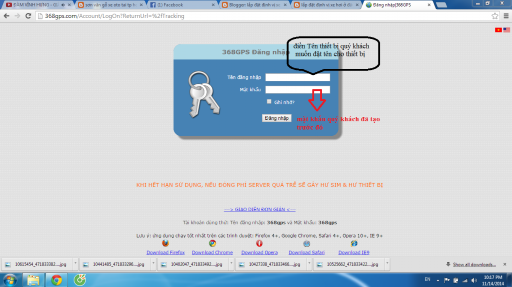 khi quý khách truy cập vào trang web http://368gps.com/ sẽ hiện ra như hình quý khách vui lòng ghi đầy đủ tên thiết bị và mật khẩu và ấn đăng nhập